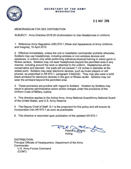 According to the newest memorandum sent out, as of May 6, 2016, soldiers are now authorized to wear headphones in the gym or fitness centers during physical training, unless told otherwise by post commanders.