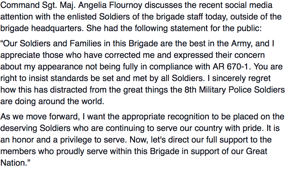 Around 12am last night, on the 8th Military Police Brigade Facebook page, a statement was released by CSM Angelia Flournoy “apologizing” for her clear violation of AR 670-1:
